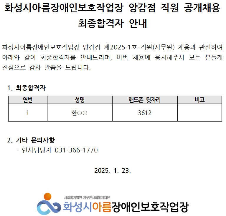 제2025-1호 직원(사무원) 공개채용 공고 최종합격자 안내