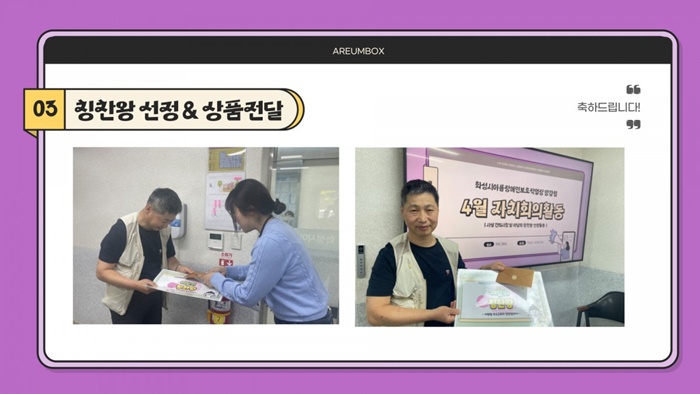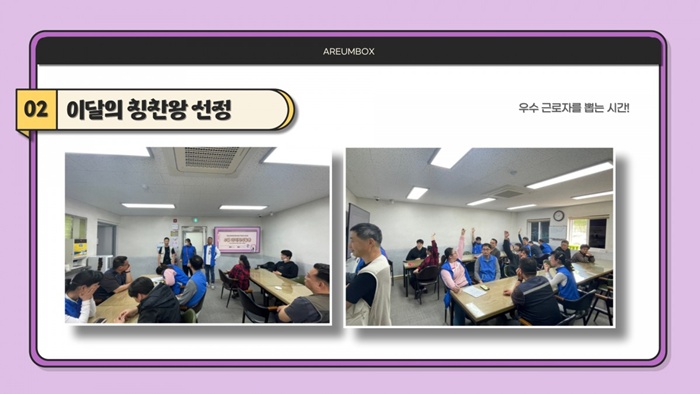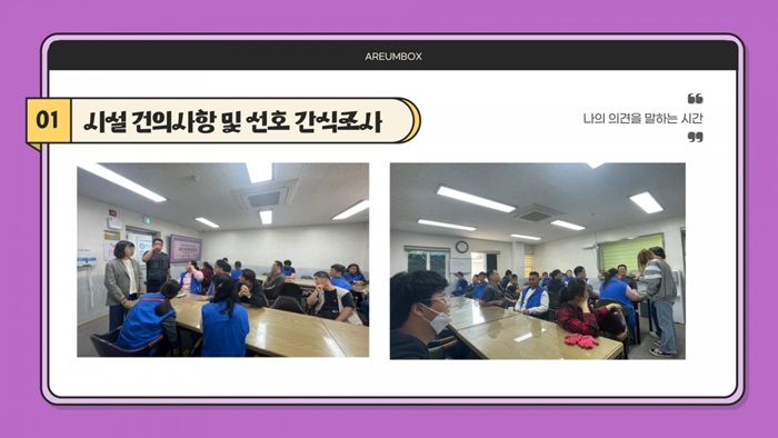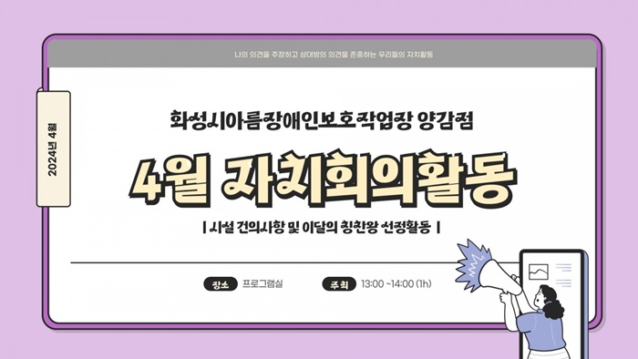 이용장애인 4월 자치회의 진행 아름박스 0 483 2024.05.14 15:39 안녕하세요. 아름보호작업장 양감점입니다~4월에도 어김없이 자치회의를 진행하였는데요.시설 건의사항과 고충처리, 청결도우미와 월별 우수 근로자 선정 시간을 가졌습니다.이번에는 우수 근로자 후보가 3명이었습니다.그 중 훈련반 이용자분이 많은 득표를 얻어 선정되었습니다. 축하드립니다