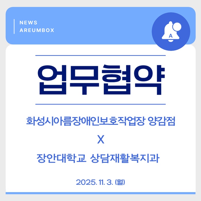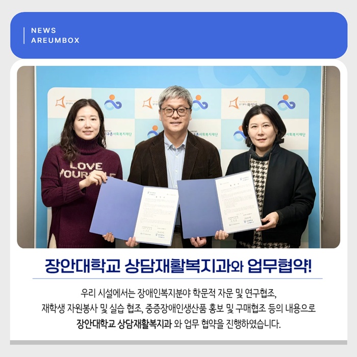 "장안대 상담재활복지과" 업무협약체결 아름박스 0 3 11.03 17:28 안녕하세요!화성시아름장애인보호작업장 양감점입니다 :)오늘은 장안대 상담재활복지과와 업무협약이 있었습니다내용은장애인복지분야 학문적 자문 및 연구협조재학생 자원봉사 및 실습 협조중증장애인생산품 홍보 및 구매협조 등등 이었는데요~!앞으로의 이용장애인분들의 복지와 안정적인 급여를 위해다양한 방면으로 노력하는화성시아름장애인보호작업장 양감점이 되겠습니다감사합니다