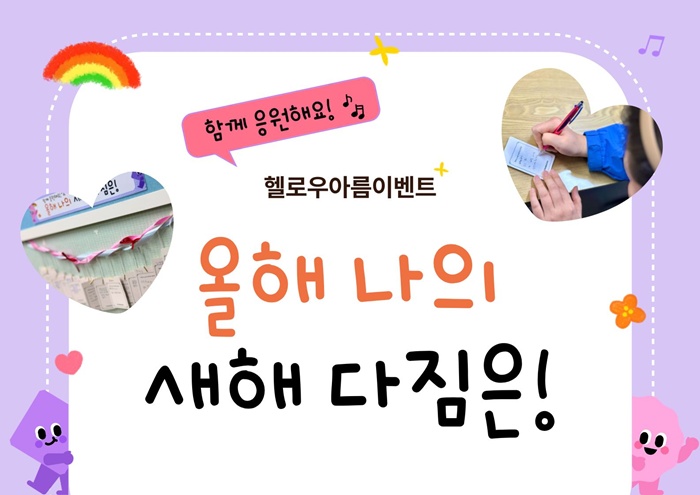 함께 응원하는 나의 새해 다짐은! 아름박스 0 17 01.29 10:57 안녕하세요!화성시아름장애인보호작업장 양감점입니다 :) 우리시설에서는요,1월 헬로우아름이벤트로 새해다짐을서로 적어보는 시간을 가졌습니다 ㅎㅎ 예쁜 종이에 오늘 새해 다짐을 고심하여 적어보고,게시판에 예쁘게 부착하여서로 함께 응원했습니다! 너무 예쁘죠!? 다이어트 ㅠㅠ 모두의 새해다짐아닌가요!! 오늘의 다짐이 한 해동안 이루어지기를 바라며다음에도 재미난 소식으로 찾아뵙겠습니다!감사합니다 :)