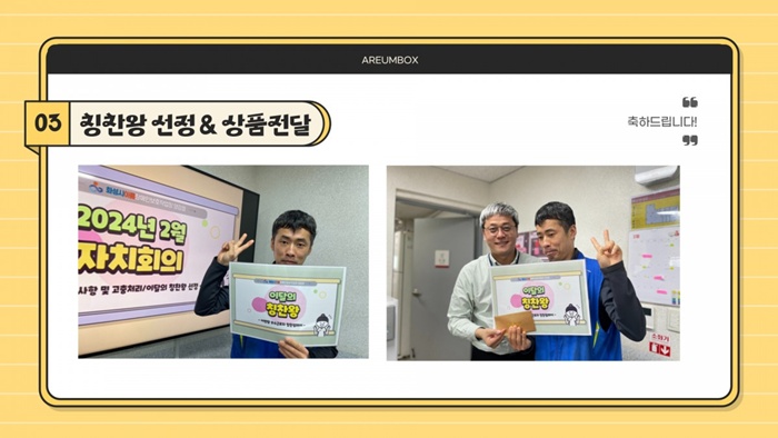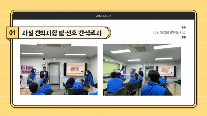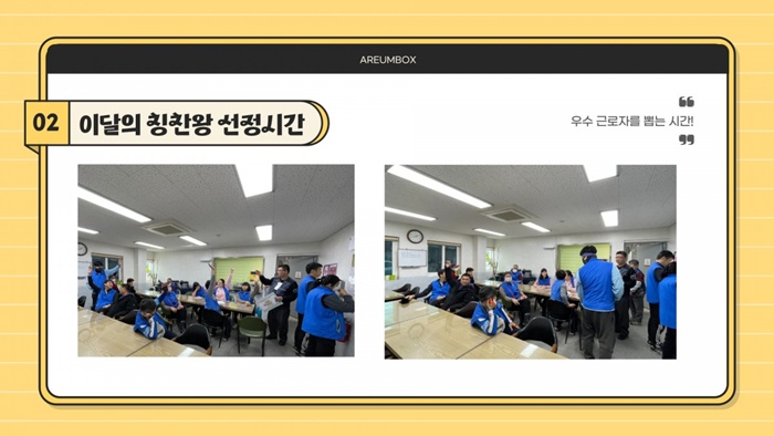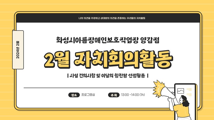 이용장애인 2월 자치회의 진행 아름박스 0 596 2024.02.29 10:27 안녕하세요. 화성시아름장애인보호작업장 양감점입니다~!저희 시설에서는 월 1회 이용자분들의 건의사항 및 고충해결을 위한 자치회의 활동을 진행합니다.2월 자치회의 활동에서 시설 건의사항 및 고충, 희망간식 조사,이달의 칭찬왕(우수이용자) 선정 활동을 진행했습니다.이번달 칭찬왕으로선정된 이용자는 타 이용자가 곤란한 상황이거나 도움을 필요로 하는 상황에서 적극적으로 도와주었다고 합니다!~축하드립니다!!