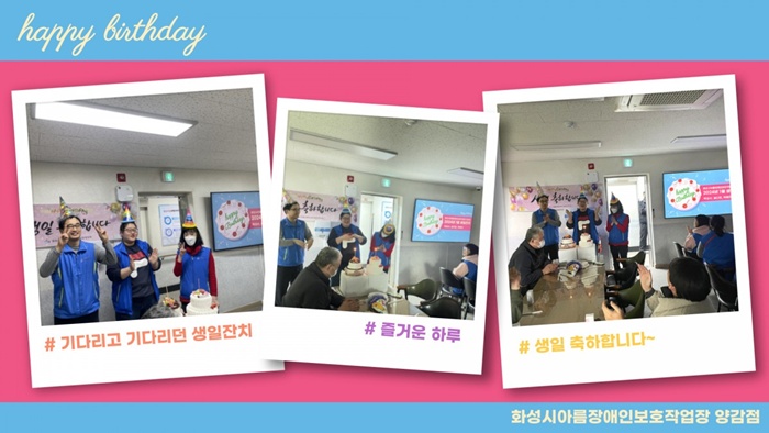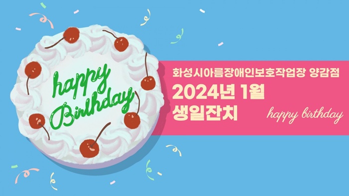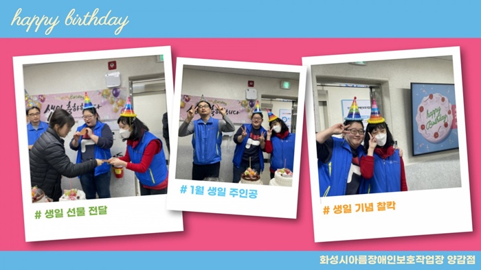 1월 생일잔치 진행 아름박스 0 547 2024.02.29 10:25 안녕하세요. 화성시아름장애인보호작업장 양감점입니다.금일 1월 생일자분들과 함께 생일잔치를 진행하였습니다~다같이 축하노래를 부르며 생일을 축하해드렸습니다!이후 생일축하선물을 드리며 함께 맛있는 케이크를 나눠먹었습니다~생일자분들 생일 축하드립니다