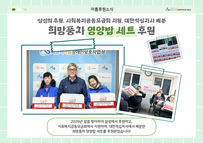 희망풍차 영양밥 세트 후원! 아름박스 0 19 02.11 17:51 안녕하세요!화성시아름장애인보호작업장 양감점입니다!!설 명절이 코앞으로 다가왔습니다!명절에 맞춰서 우리 이용장애인분들이풍족하게 보내실 수 있도록삼성에서 후원하고,사회복지공동모금회에서 지원하며,대한적십자사에서 배분한희망풍차 영양밥 세트를 나눠드렸습니다!설 명절에도, 맛있는 영양밥세트로 풍족하고 건강하며 배부른 하루하루를 보내시길 바랍니다!!그리고 추가소식!이대로 끝나면 우리 아름박스가 아니죠!!내일 또 풍성한 소식이 있을지도 모르니두눈 크게 뜨고 확인해주세요!!감사합니다 ;)