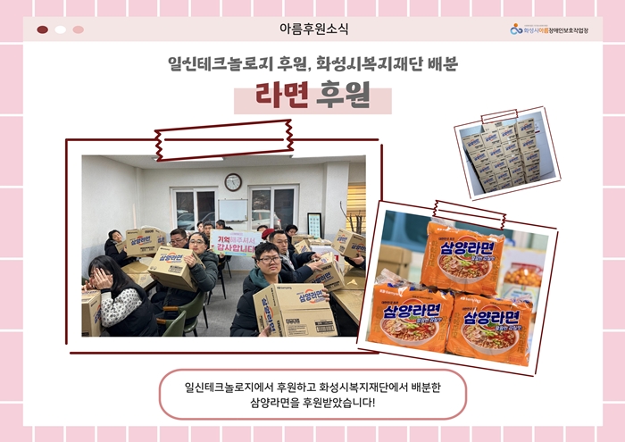 삼양라면이 왔어요~! 아름박스 0 13 02.13 09:54 안녕하세요!화성시아름장애인보호작업장 양감점입니다!!우리 이용장애인분들이 풍족한명절을 보내실 수 있도록 풍성한 소식을 예고했었는데요!!!!바로 라면 1박스를 드렸습니다.무려 40개입입니다!!일신테크놀로지에서 후원하고,화성시복지재단에서 배분한 삼양라면을나눠드렸는데요,또 어떤 선물이 있을까요!? 기대해주세요!감사합니다 ;)